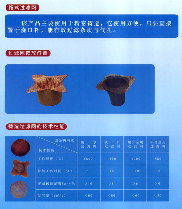 常州市猛將過濾網(wǎng)有限公司是專業(yè)生產(chǎn)系列鑄造過濾網(wǎng)的廠家。主要產(chǎn)品有:鐵水過濾網(wǎng)、鋼水過濾網(wǎng)、銅水過濾網(wǎng)、鋁水過濾網(wǎng)及熔模用帽式過濾網(wǎng)等。本廠產(chǎn)品是哈工大科研成果,榮獲國(guó)家經(jīng)委頒發(fā)的新技術(shù)成果獎(jiǎng)。航天部科技進(jìn)步一等獎(jiǎng);中國(guó)質(zhì)量檢驗(yàn)協(xié)會(huì)授予“猛將”牌高硅氧過濾網(wǎng)“國(guó)家權(quán)威檢測(cè)達(dá)標(biāo)產(chǎn)品”榮譽(yù)證書;我廠生產(chǎn)的“四角帽式過濾網(wǎng)”獲國(guó)家專利局外觀設(shè)計(jì)專利證書;并獲香港國(guó)際新技術(shù)新產(chǎn)品博覽會(huì)“金獎(jiǎng)證書”。2002年獲亞洲國(guó)際新技術(shù)新產(chǎn)品博覽會(huì)“科技發(fā)明進(jìn)步獎(jiǎng)”,2002年本廠所生產(chǎn)的“四角帽式過濾網(wǎng)在首屆“金艦杯”國(guó)際新技術(shù)成果網(wǎng)絡(luò)交易會(huì)活動(dòng)中成績(jī)顯著,被評(píng)為金杯獎(jiǎng)。同年在日內(nèi)瓦國(guó)際專利技術(shù)成果博覽會(huì)中被評(píng)為國(guó)際優(yōu)秀專利金獎(jiǎng)。目前,本廠產(chǎn)品銷往全國(guó)各省、市、自治區(qū),是國(guó)內(nèi)銷量最大的廠家之一。同時(shí)出口韓國(guó)、泰國(guó)、東南亞等國(guó)家。進(jìn)入21世紀(jì)以來,我國(guó)加入WTO后,我廠在哈工大葉榮茂教授的指導(dǎo)下,開發(fā)研制出一種多孔泡沫陶瓷過濾網(wǎng),該產(chǎn)品兼具玻璃纖維過濾網(wǎng)和直孔過濾網(wǎng)的篩分夾渣功能,且更具有吸附微小夾渣氧化物的功能。多孔泡沫陶瓷過濾網(wǎng)的主要工作原理是讓紊亂、翻騰的(TV urbuItnt Flow)金屬液經(jīng)過產(chǎn)品形成平穩(wěn)、均勻(SmoothFlow)的金屬液,金屬液經(jīng)過復(fù)雜的多孔泡沫陶瓷過濾網(wǎng),能有效地吸附截留微小氧化夾渣物,并溢除氣泡,然后能使鑄件產(chǎn)品達(dá)到純潔度高、強(qiáng)度高、韌性好、機(jī)械加工性能好等特點(diǎn),從而能夠降低生產(chǎn)成本,提高產(chǎn)品成品率,增加經(jīng)濟(jì)效益。我廠熱忱歡迎廣大用戶使用該產(chǎn)品。 我公司設(shè)計(jì)發(fā)明的“四角帽式過濾網(wǎng)”,已在2001年3月申請(qǐng)專利,并于當(dāng)年11月底經(jīng)中華人民共和國(guó)知識(shí)產(chǎn)權(quán)局授權(quán)公告。頒布了外觀設(shè)計(jì)專利證書,證書號(hào)第207620號(hào)。現(xiàn)有個(gè)別廠家悍然侵權(quán),公然在有關(guān)鑄造媒體打出侵權(quán)產(chǎn)品廣告。對(duì)此,我們鄭重聲明,要求侵權(quán)廠家盡快采取糾正措施,為了維護(hù)我們的知識(shí)產(chǎn)權(quán),我們不排除采取法律行動(dòng)的可能。