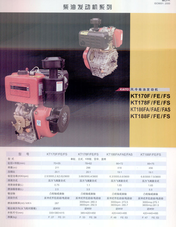 常州常柴集團(tuán)凱拓電動機(jī)械有限公司是常柴集團(tuán)所屬,集自主研發(fā)設(shè)計(jì)及生產(chǎn)的出口型產(chǎn)業(yè)基地。 常柴集團(tuán)是一家擁有近一萬名在職員工的國有大型企業(yè),年均產(chǎn)值近三億美元,平均出口總額近八千萬美元,同時也是中國內(nèi)地五百強(qiáng)企業(yè)之一。 常柴集團(tuán)凱拓電動機(jī)械有限公司的主要產(chǎn)品流水線基于日本YAMMAR型超級風(fēng)冷柴油發(fā)動機(jī),以及其配套發(fā)電機(jī)組,水泵機(jī)組和數(shù)碼變頻發(fā)電機(jī),我司目前擁有常柴集團(tuán)及凱拓品牌的知名商標(biāo)使用權(quán),旗下所有分廠如機(jī)械加工廠、鑄造廠以及發(fā)動機(jī)廠等生產(chǎn)基地都通過了ISO9001-2000質(zhì)量管理體系認(rèn)證。我司自主品牌凱拓柴油發(fā)電機(jī)組KT5000SE,KT5000LE,數(shù)碼變頻發(fā)電機(jī)KT1000Ti以及柴油發(fā)動機(jī)186F均通過德國TUV公司的CE認(rèn)證,美洲EPA認(rèn)證,因此出口量很大,近年來公司產(chǎn)品已遠(yuǎn)銷美洲、歐洲、非洲以及東南亞國家和地區(qū)! ∫劳谐2窦瘓F(tuán)的領(lǐng)先技術(shù),強(qiáng)有力的管理體制,以及健全的產(chǎn)品質(zhì)量體系,我司通過不斷優(yōu)化自主設(shè)計(jì)研發(fā),完善管理機(jī)制,期望能夠以提供最優(yōu)質(zhì)的產(chǎn)品售后服務(wù)進(jìn)一步拓展國際市場! ”局皥F(tuán)結(jié)、合作、奮斗”的公司理念,我們希望著眼全球,與更多潛在的客戶開展合作交流,最終實(shí)現(xiàn)雙贏的戰(zhàn)略目標(biāo)。