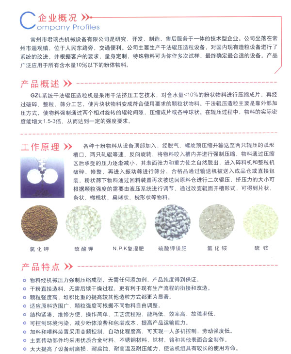 常州市君瑞機(jī)械設(shè)備有限公司是研究、開發(fā)、制造及售后服務(wù)于一體的技術(shù)型企業(yè)。公司坐落于常州市橫山橋金豐工業(yè)集中區(qū),毗鄰戚月公路與232省道,距滬蓉高速3公里,地理位置優(yōu)越,交通便捷。 公司在干燥造粒設(shè)備的開發(fā)、研究中不斷地創(chuàng)新及改造,設(shè)計(jì)制造了一系列工藝先進(jìn)且節(jié)能的產(chǎn)品。并根據(jù)市場(chǎng)的需要研制開發(fā)了幾十種干燥、造粒、混合、除塵系列,產(chǎn)品廣泛適用于肥料,石膏粉.制藥、化工、食品、輕工,煤粉,各類助劑.工業(yè)原料等行業(yè)深受用戶好評(píng)。主要生產(chǎn)干法輥壓造粒設(shè)備,對(duì)國內(nèi)現(xiàn)有的造粒設(shè)備進(jìn)行了系統(tǒng)的改進(jìn),并根據(jù)客戶的要求,量身定制,特殊物料可為你作多次試樣,最終確定最適合的設(shè)備。產(chǎn)品廣泛用于所有含水量10%一下的粉體物料。 公司秉承“以技術(shù)和人才為本,以市場(chǎng)需求為導(dǎo)向”,我們不僅向客戶提供優(yōu)質(zhì)的產(chǎn)品,而且以全方位的服務(wù)滿足眾多客戶的更新、更高的要求。 熱忱歡迎新老客戶、國內(nèi)外各界朋友蒞臨指導(dǎo),攜手共進(jìn),共創(chuàng)未來!