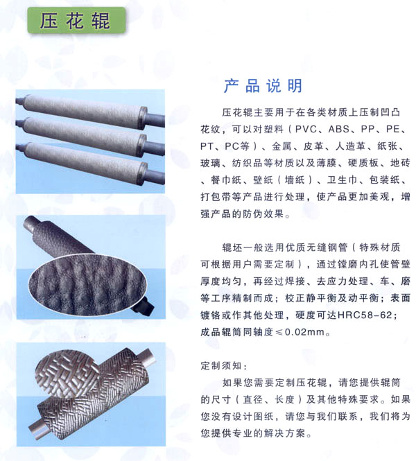 常州市武進區(qū)禮嘉鎮(zhèn)萬超機械有限公司專業(yè)生產(chǎn)、加工花輥、鏡面輥、無紡布設備,及各類機械配件。產(chǎn)品廣泛應用于金屬、塑料、皮革、紙張、玻璃、木材、無紡布、衛(wèi)生材料、包裝裝潢等行業(yè)。 公司經(jīng)營方針:服務鍥而不舍 品質(zhì)力臻卓越。得到國內(nèi)眾多客戶的厚愛與好評。 歡迎各界朋友蒞臨常州萬超機械有限公司指導和業(yè)務洽談。 萬超為顧客免費打樣、并代客壓紋!