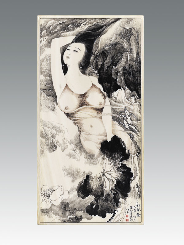 1 牙刻《和風圖》是極具創(chuàng)意構思新穎的原創(chuàng)作品,水墨雅韻橫生,荷花玉色高潔,仙子和風飄逸。作品以花擬人以人喻花,兼工帶寫相應成輝,刀法隨意而變,大膽強調紅與黑的民族審美符號,抒發(fā)作者對美的呼喚、對荷的傾訴。仙子冰雪的肌膚,豐美的體態(tài),洋溢著青春的氣息,散發(fā)出蓬勃的生機。