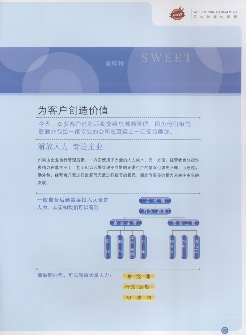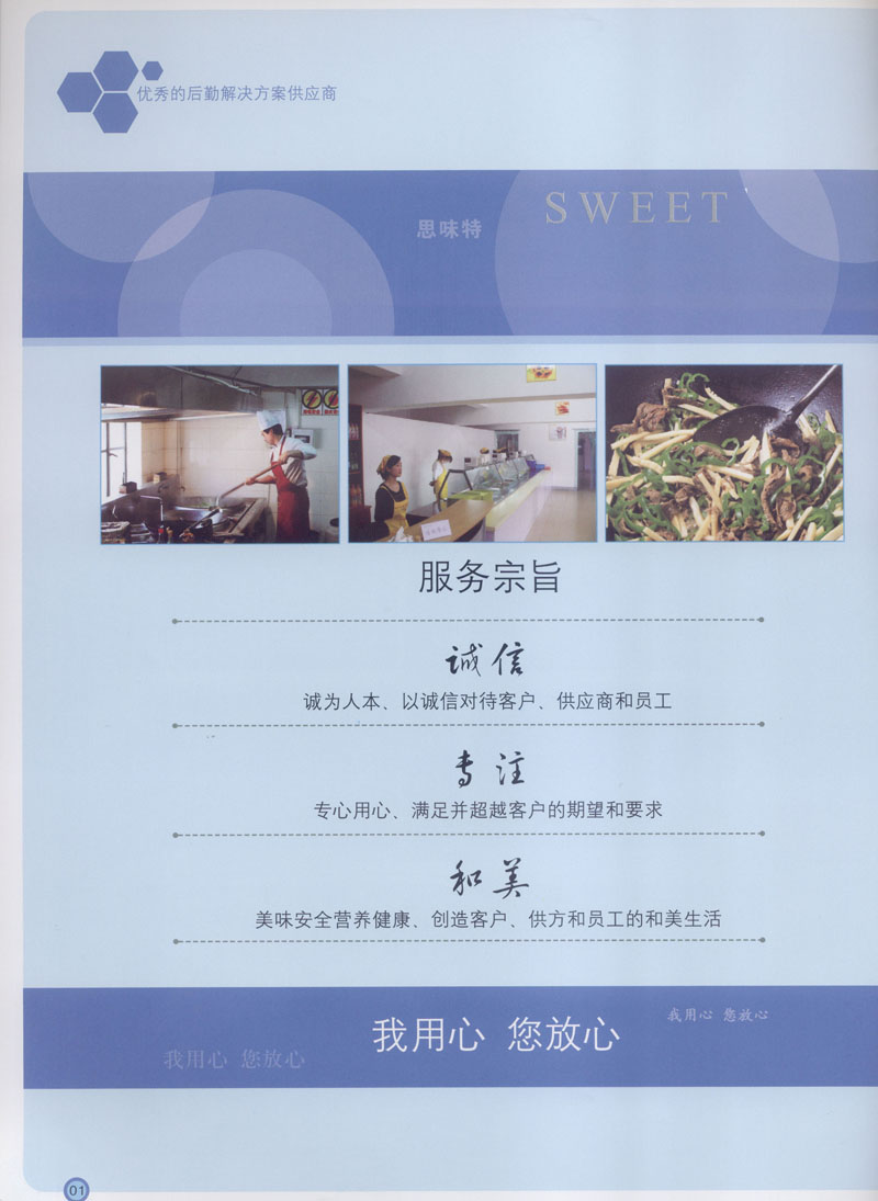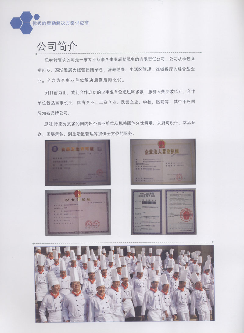 常州市思味特餐飲有限公司是一家專(zhuān)業(yè)從事企事業(yè)后勤服務(wù)的有限責(zé)任公司,公司從承包食堂起步,逐漸發(fā)展為經(jīng)營(yíng)團(tuán)膳承包、營(yíng)養(yǎng)送餐、生活區(qū)管理、連鎖餐廳的綜合型企業(yè)。2008年公司斥資100萬(wàn)元,在常州興建了可以同時(shí)提供3000餐膳食的中央廚房,重點(diǎn)打造“和美客”后勤服務(wù)品牌,全力為企事業(yè)單位解決后勤后顧之憂。 到目前為止,我們合作成功的企事業(yè)單位超過(guò)50多家,服務(wù)人數(shù)突破15萬(wàn),合作單位包括國(guó)家機(jī)關(guān)、國(guó)有企業(yè)、三資企業(yè)、民營(yíng)企業(yè)、學(xué)校、醫(yī)院等,其中不乏國(guó)際知名品牌公司。 和美客愿為更多的國(guó)內(nèi)外企事業(yè)單位及機(jī)關(guān)團(tuán)體分憂解難,從廚房設(shè)計(jì)、菜品配送、團(tuán)膳承包、到生活區(qū)管理等提供全方位的服務(wù)。