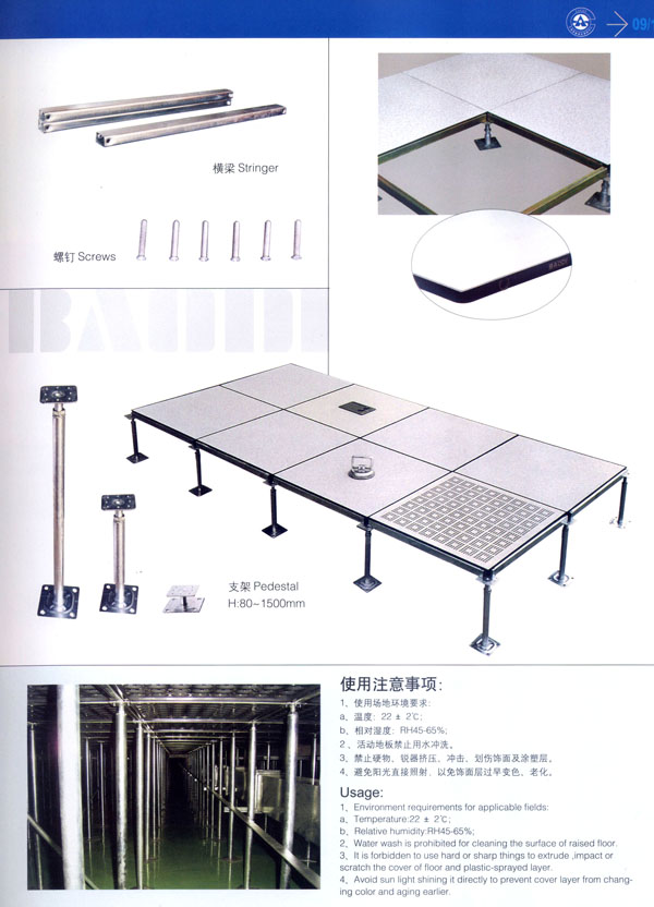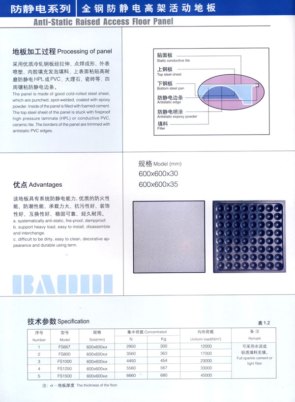 常州市寶進(jìn)防靜電設(shè)備有限公司是各類防靜電產(chǎn)品開發(fā)、設(shè)計(jì)、制造、安裝服務(wù)于一體的企業(yè)。以上海物理學(xué)會空間靜電專業(yè)委員會強(qiáng)大的技術(shù)力量為后盾。公司主要致力于各類機(jī)房、電氣室設(shè)計(jì)、安裝;各類防靜電干擾處理及用戶特種需求。公司擁有防空間靜電干擾—聲學(xué)復(fù)合系統(tǒng)、輕質(zhì)全鋼活動地板、高環(huán)保型抗靜電貼面等多項(xiàng)發(fā)明專利,是國內(nèi)該行業(yè)中唯一擁有自主知識產(chǎn)權(quán)的企業(yè)。 公司主要產(chǎn)品“寶迪”牌 防靜電高架地板及板材、OA網(wǎng)絡(luò)地板。產(chǎn)品廣泛用于電子廠房、金融系統(tǒng)、電力、廣電、軍隊(duì)及智能化樓宇。并向多個(gè)國家出口。 針對發(fā)泡水泥填充的全鋼高架地板自身重、承載差的缺點(diǎn),我們開發(fā)了輕質(zhì)全鋼高架地板。在提前地板承載的同時(shí),大幅減輕了地板的自重。 公司一貫嚴(yán)格執(zhí)行ISO9001-2000質(zhì)量保證體系,為用戶提供高品質(zhì)的產(chǎn)品及完善的售后服務(wù)是公司一貫的宗旨。