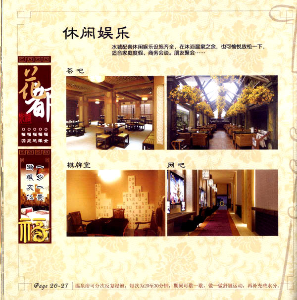 淹城花都溫泉水城孕育天地之精華,悅身、悅?cè)、悅心、悅神。置身其中泉水潺潺,霧氣繚繞、花瓣飄香,恍若仙境。“掬水月在手,弄花香滿衣”,花都溫泉的浪漫與溫潤在這里完美展現(xiàn)。 花都溫泉水城包括洗浴區(qū)、戲水世界、露天溫泉、自助餐廳、生態(tài)房、別墅區(qū)、紅文化房、VIP區(qū)等多種功能區(qū)域,是集溫泉養(yǎng)生、休閑住宿、演藝會務(wù)為—體的休閑度假勝地,給賓客帶來江南小鎮(zhèn)的浪漫水城之旅。 古木新枝畔賓客對酒當(dāng)歌,溪泉石椅旁把茶品啜。 淹城-三勤生態(tài)酒店,這里是一處綠色生態(tài)的美食家園。此地鬼斧神工.奇水異石,和風(fēng)細(xì)雨林中穿過,引百鳥朝來暮歌;這里集生態(tài)餐飲、演藝、中小型會務(wù)為一體,將現(xiàn)代裝飾風(fēng)格和古雅拙樸的自然裝修完美整合;這里聚集大江南北名廚,推出精致綠色美昧佳肴。來到這里,賓客可享田園至美之景,品舌尖至鮮之味,實乃人生一大樂事。