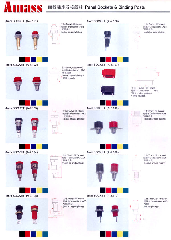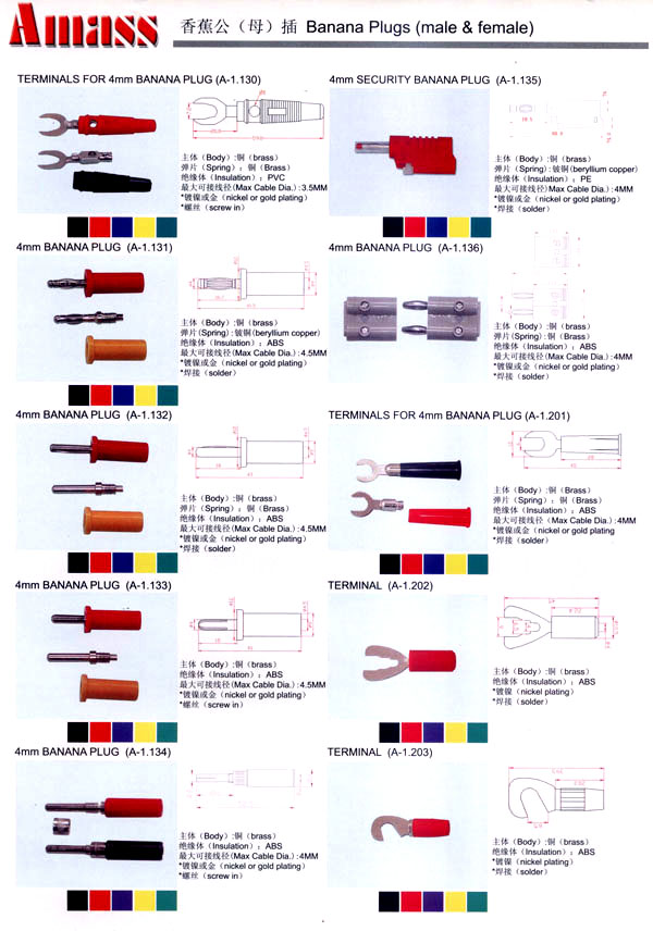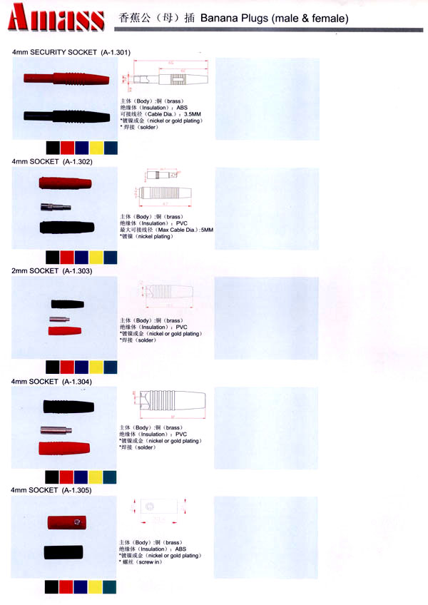 本公司專業(yè)生產(chǎn)各類香蕉插頭,香蕉插座,接線柱,電瓶夾,鱷魚夾,測(cè)試導(dǎo)線,測(cè)試筆等。產(chǎn)品分2mm/2.5mm/3mm/3.5mm/4mm五大系列,百余種款式, 各種香蕉插廣泛用于儀器、儀表、電力測(cè)試、教學(xué)、玩具,視聽設(shè)備、醫(yī)療儀器,保健產(chǎn)品等領(lǐng)域。公司技術(shù)力量雄厚,生產(chǎn)工藝先進(jìn),產(chǎn)品遠(yuǎn)銷港、臺(tái)、歐美,并與飛利浦等國(guó)際品牌配套。公司本著精益求精的理念,歡迎新老客戶光臨。