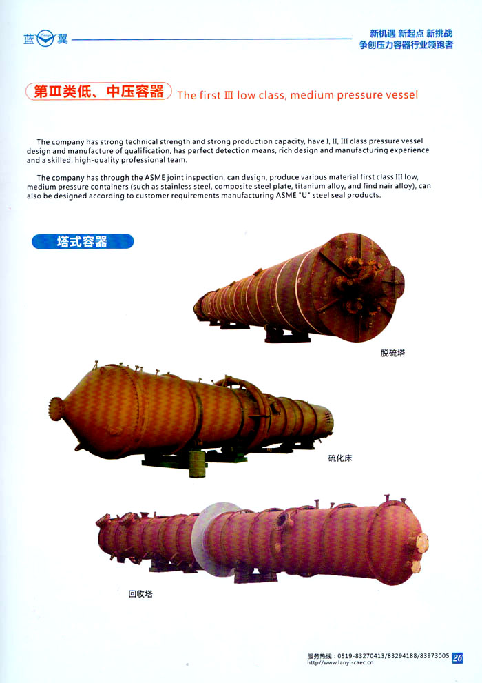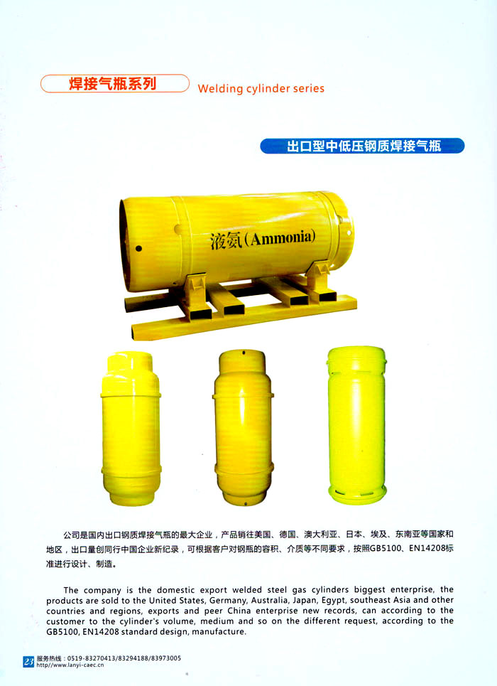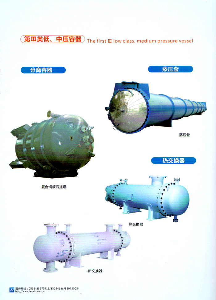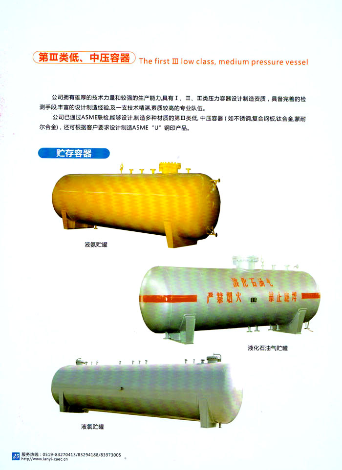 主要產(chǎn)品 中高壓航空滅火瓶、鋼質(zhì)焊接氣瓶、第三類低,中壓力容器、蒸壓釜、換熱器、民用核承壓設(shè)備、5至160立方米各類介質(zhì)貯罐、各種型號(hào)罐式集裝箱、生物工程設(shè)備、液化天然氣(LNG)車用氣瓶、液化天然氣(LNG)加氣站、乙炔工程設(shè)備、樹脂生產(chǎn)設(shè)備、核電工程設(shè)備、船舶專用設(shè)備等。