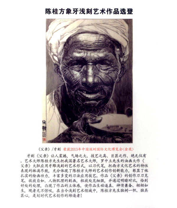 陳桂方,江蘇常州武進(jìn)人,中國(guó)著名雕刻藝術(shù)家,江蘇省工藝美術(shù)大師、研究員級(jí)、高級(jí)工藝美術(shù)師,江蘇省非物質(zhì)文化遺產(chǎn)《象牙淺刻》代表性傳承人。畢業(yè)于中國(guó)書畫函授大學(xué),深造于清華大學(xué)、南大美術(shù)系,現(xiàn)任中國(guó)工藝美術(shù)協(xié)會(huì)會(huì)員,江蘇省工藝美術(shù)學(xué)會(huì)理事,常州市工藝美術(shù)家協(xié)會(huì)副秘書長(zhǎng),常州市工藝美術(shù)行業(yè)協(xié)會(huì)常務(wù)理事,武進(jìn)工藝美術(shù)協(xié)會(huì)副主席。陳桂方大師淺刻作品的藝術(shù)特點(diǎn):山水氣韻生動(dòng),氣勢(shì)磅礴,場(chǎng)面壯觀,刀法細(xì)膩:人物仕女生動(dòng)可人,栩栩如生,充分表達(dá)體現(xiàn)了中國(guó)象牙工藝獨(dú)具的內(nèi)在文化底蘊(yùn)和現(xiàn)代社會(huì)的審美觀念及獨(dú)特的淺刻藝術(shù)表現(xiàn)技藝。對(duì)每件藝術(shù)作品創(chuàng)作都精益求精,強(qiáng)調(diào)藝術(shù)創(chuàng)作的思想性、意境及內(nèi)涵。注重章法構(gòu)思,掌握牙刻藝術(shù)的特性表現(xiàn),作品具有鮮明生動(dòng)的時(shí)代氣息,獨(dú)具所創(chuàng)工筆與寫意相結(jié)合的牙刻藝術(shù)表現(xiàn)手法和表現(xiàn)形式,出眾、飄逸、多變的刀法技藝,粗獷處見細(xì)微、方寸間見大觀的創(chuàng)作理念深受專家權(quán)威的肯定和業(yè)內(nèi)人士的一致好評(píng)。陳桂方大師至企頑事象牙淺刻藝術(shù)創(chuàng)作近四十余載,完善了自己的創(chuàng)作體系,成就了自己獨(dú)特的藝術(shù)風(fēng)格。作品數(shù)年來連續(xù)二十多次榮獲國(guó)家最高藝術(shù)精品大獎(jiǎng)《金獎(jiǎng)》,象牙淺刻作品《李逵探母》已被國(guó)家工藝美術(shù)館收藏,并頒發(fā)了國(guó)家收藏證書,在全國(guó)數(shù)十年間尚屬首次。當(dāng)前,陳桂方牙刻藝術(shù)作品已深受廣大海內(nèi)外業(yè)內(nèi)人士、收藏家們的鐘愛、青睞、熱藏,并被譽(yù)為當(dāng)代最杰出最具潛質(zhì)的實(shí)力派藝術(shù)大師。