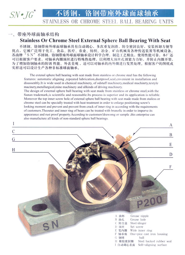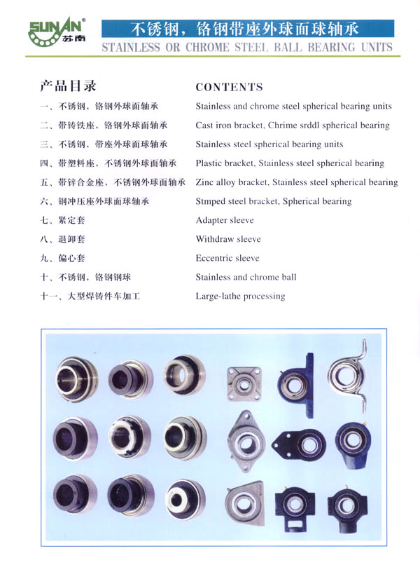常州市武進蘇南軸承有限公司是生產(chǎn)鋼球及帶座外球面軸承的專業(yè)工廠,主要生產(chǎn)蘇南牌“SN”不銹鋼球、鉻鋼鋼球,以及不銹鋼、鉻鋼UC、UCX、UK、HC、SB、SA、SER、UOOO、KOOO及其它非標(biāo)系列各類帶座外球面軸承、偏心套、緊定套等產(chǎn)品。本廠生產(chǎn)規(guī)格有軸承鋼球0.5-150m/m,碳鋼球0.5-150m/m,不銹鋼球0.8-50m/m,同時定做各種特殊規(guī)格的不銹鋼球、銅球、陶瓷球等。為廣大用戶提供品質(zhì)優(yōu)良,規(guī)格齊全,價格合理的各種鋼球。 本公司位于常州南部,錫宜高速公路串境而過, 交通便利。南瀕風(fēng)景秀麗的太湖,沿湖丘陵地帶人文景觀豐富,為常州市武進區(qū)太湖旅游度假區(qū) 。本廠環(huán)境優(yōu)美,具有良好的生產(chǎn)環(huán)境,我們竭誠歡迎國內(nèi)外的朋友進行廣泛多樣的經(jīng)濟合作交往和貿(mào)易合作,并為你提供優(yōu)良的服務(wù)。 本公司技術(shù)力量雄厚,工藝裝備先進,檢測手段完備,產(chǎn)品質(zhì)量穩(wěn)定,使用性能各項指標(biāo)都達(dá)到國際先進水平,產(chǎn)品主要銷往美國、法國、德國、日本、意大利、澳大利亞、韓國、加拿大、及東南亞等國家和地區(qū)。本公司的“SN”商標(biāo)鋼球及帶座外球面軸承已贏得國內(nèi)外廣大用戶的信賴。 本公司具有外貿(mào)自營出口權(quán),并于2002年9月通過ISO9001-2000版質(zhì)量體系認(rèn)證,于2004年8月通過“CQC”產(chǎn)品質(zhì)量認(rèn)證。