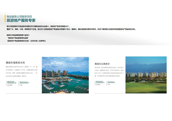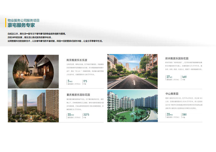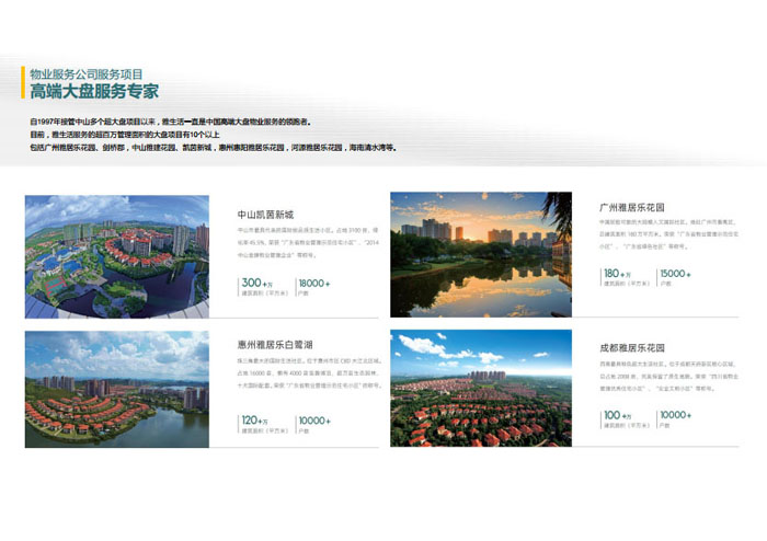 一、立足北上廣,面向全中國(guó),走向全世界 1992年,雅居樂(lè)物業(yè)開(kāi)篇中山,率先引入港式物業(yè)管理模式。1997年,依托雅居樂(lè)地產(chǎn)的崛起,連續(xù)接管中山多個(gè)項(xiàng)目,成為高端大盤(pán)物業(yè)管理的領(lǐng)跑者。1999年,雅居樂(lè)物業(yè)開(kāi)啟專業(yè)化發(fā)展模式,全面通過(guò)英國(guó)皇家BSI的ISO9000質(zhì)量管理體系認(rèn)證,2001年成為國(guó)家首批一級(jí)物業(yè)管理資質(zhì)企業(yè)。 2002年,隨著廣州雅居樂(lè)花園的盛大啟幕,雅居樂(lè)物業(yè)邁開(kāi)向廣州進(jìn)軍的步伐。為尋求更長(zhǎng)遠(yuǎn)的發(fā)展,雅居樂(lè)積極構(gòu)思上市藍(lán)圖,2005年在香港成功上市。在深耕珠三角城市群的同時(shí),2006年雅居樂(lè)物業(yè)揮師北上,正式開(kāi)啟全國(guó)部署戰(zhàn)略。2008年,接管海南清水灣項(xiàng)目,揭開(kāi)旅游地產(chǎn)物業(yè)管理的新篇章。 接下來(lái)近十年里,雅居樂(lè)物業(yè)始終保持著最年輕的成長(zhǎng)姿態(tài),依托“管理數(shù)字化、服務(wù)專業(yè)化、流程標(biāo)準(zhǔn)化和操作機(jī)械化”的發(fā)展戰(zhàn)略,雅居樂(lè)物業(yè)榮膺2018中國(guó)物業(yè)服務(wù)百?gòu)?qiáng)企業(yè)第11名,2018年中國(guó)物業(yè)服務(wù)百?gòu)?qiáng)企業(yè)成長(zhǎng)性第二名、2018年中國(guó)物業(yè)服務(wù)百?gòu)?qiáng)服務(wù)質(zhì)量領(lǐng)先企業(yè)、2018年中國(guó)物業(yè)服務(wù)百?gòu)?qiáng)滿意度領(lǐng)先企業(yè)、2018中國(guó)物業(yè)服務(wù)百?gòu)?qiáng)經(jīng)營(yíng)績(jī)效領(lǐng)先企業(yè)、旅游地產(chǎn)物業(yè)管理領(lǐng)先品牌、2018年中國(guó)辦公物業(yè)管理優(yōu)秀企業(yè)(綠地物業(yè))、2017中國(guó)物業(yè)管理企業(yè)品牌價(jià)值第12名、2017中國(guó)物業(yè)管理企業(yè)綜合實(shí)力第12名、中國(guó)藍(lán)籌物業(yè)企業(yè)、《旅游地產(chǎn)物業(yè)管理服務(wù)標(biāo)準(zhǔn)》(團(tuán)體標(biāo)準(zhǔn))起草工作等多項(xiàng)殊榮。 目前,雅生活集團(tuán)已形成廣州、中山、深圳、南京、上海、西安、成都、海南、云南、北京、鄭州、南寧、沈陽(yáng)、武漢、馬來(lái)西亞十五大城市公司全面發(fā)展的蓬勃態(tài)勢(shì)。截止2017年12月31日,雅生活集團(tuán)管理范圍覆蓋全國(guó)逾69座城市與地區(qū),服務(wù)類型涵蓋主流住宅、高端豪宅、旅游地產(chǎn)、商業(yè)、寫(xiě)字樓等多種業(yè)態(tài),合約總建筑面積為12610萬(wàn)平方米,擁有200多個(gè)項(xiàng)目,服務(wù)業(yè)主逾100萬(wàn)人。 2017年6月,雅生活集團(tuán)收購(gòu)綠地物業(yè)100%股權(quán),并與綠地集團(tuán)簽署戰(zhàn)略合作協(xié)議,8月,綠地集團(tuán)投資10億元獲得雅生活集團(tuán)20%股權(quán)。未來(lái),雅生活集團(tuán)將實(shí)施“雅居樂(lè)物業(yè)”與“綠地物業(yè)”雙品牌驅(qū)動(dòng)戰(zhàn)略,還將尋求在A股上市,力爭(zhēng)打造中國(guó)物業(yè)“A+H”第一股。
