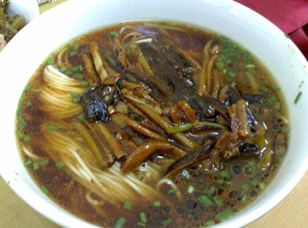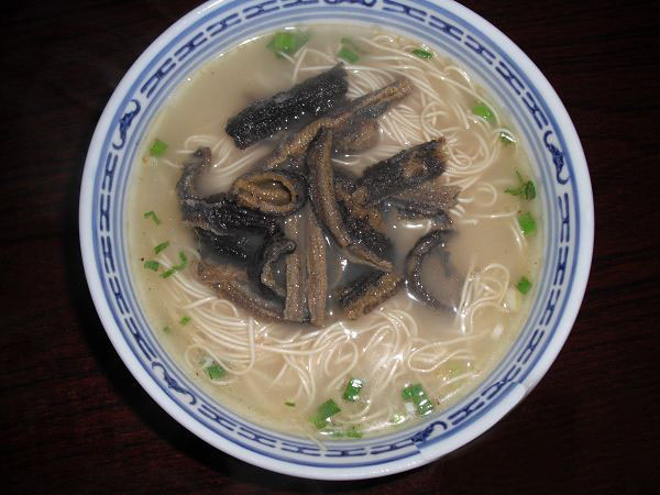 常州新北區(qū)孟河公陽(yáng)小吃店從事鱔絲面23年,經(jīng)營(yíng)面積100平方米,黃鱔全是野生,面湯采用高湯制作(鱔魚(yú)湯),下面的時(shí)候先用開(kāi)水把黃鱔燙熟,然后用竹刀批下二條黃鱔肉,除去骨頭肚腸,切成段后入油鍋里炸酥,再用白湯烹制成為面澆頭。而面湯是用鱔魚(yú)骨頭、豬骨等用大鍋猛火煮上三、四個(gè)鐘頭,成為一鍋濃濃的白湯,再進(jìn)行調(diào)味,吃到嘴里全身舒坦。