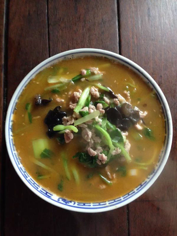 武進區(qū)青城面館經(jīng)營面積280平方米左右,主要特色是現(xiàn)炒肉絲,素菜蓋澆面,面館創(chuàng)始人今年63歲的王蘭珍,她對美食有著高于常人的悟性。她開過饅頭店,開過小飯館,承包過食堂,燒菜、取料樣樣在行,吃過的人常常贊不絕口。 20世紀初,在跟德興面館的老師傅學了做面手藝后,王蘭珍萌生了開一家面館的想法,除了可以養(yǎng)家糊口,最重要的是想讓更多人嘗嘗自己的手藝。于是,她在自己的住處擺起了幾張桌椅,面館就算正式營業(yè)了。因為家住青城橋,王蘭珍干脆取名“青城面館”。 “從早上5點多開始營業(yè),到下午1點多打烊,一天至少要賣掉300多碗面,用掉近160斤面粉!睘楹吻喑敲骛^的面條如此受歡迎,兒媳婦陸偉紅說秘訣在于湯頭和澆頭。湯頭分白湯和紅湯,白湯是由10斤豬骨頭熬制而成,湯色清澈而味道濃郁;紅湯以骨頭湯作底湯,加入茴香、甘草、草果等20多種中草藥,以及糖、醬油等調(diào)味品,鮮而不腥,散發(fā)出陣陣香味。 和一般面館事先燒制好澆頭,放在盆里供客人選擇不同,青城面館的澆頭都是一份份現(xiàn)炒的,特別講究食材的新鮮。就拿暢銷的肉絲蔬菜紅湯面來說,要先起猛火,把肉絲、木耳、蘑菇、青菜等食材放一起煸炒至香,然后澆在撈起的面條上。一碗面出來,現(xiàn)炒的澆頭與面條融合,味道香郁至極。 遙觀人的早晨,醒得有些早。對很多遙觀人來說,美好的一天是從青城面館開始的。那一碗碗現(xiàn)炒的蓋澆面,筋道爽滑、醬香味濃,溫存著他們的胃與記憶,帶來刻進骨子里的家鄉(xiāng)味道。