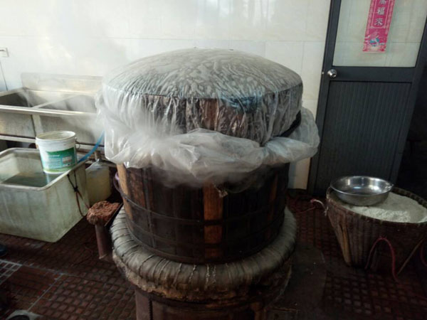第一步:蒸糯米飯,老徐先用煤爐將水燒開,再將洗凈泡好的糯米放入一只大木桶中,放在爐子上蒸。除此以外,老徐還要不斷攪拌,保證糯米受熱均勻,直至散發(fā)出水蒸氣。為了保證米飯溫度,老徐特地用塑料薄膜將木桶封住,并用皮筋加固。蒸糯米飯,大約需要半個多小時。