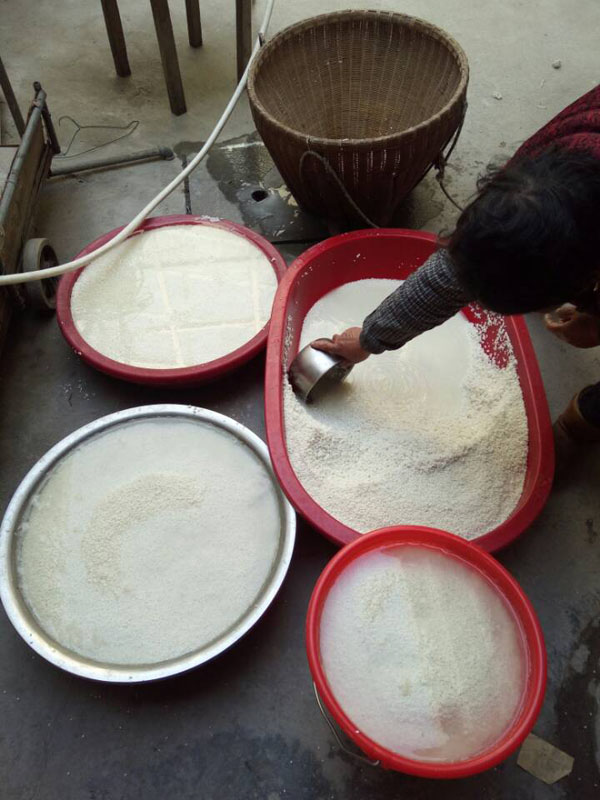 第二步:冷卻降溫,糯米蒸熟后,用冷水淋沐,直至糯米飯溫度降到35℃左右。要知道這個溫度非常關(guān)鍵,太冷了會影響之后酒曲發(fā)酵,溫度太高會把酒曲中的酵母殺死。不靠溫度計,老徐靠得完全是自己多年的經(jīng)驗。