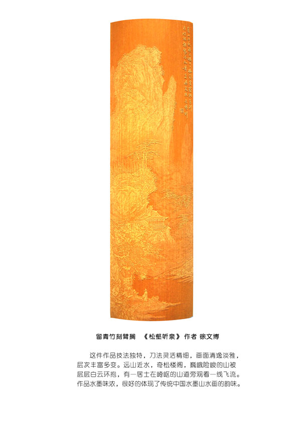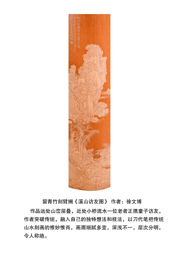 徐博(藝名文博),1973年生,江蘇武進(jìn)人,江蘇省省名人,高級工藝美術(shù)師,常州市留青竹刻非遺傳承人,常州工藝美術(shù)家協(xié)會理事,被譽(yù)為當(dāng)今中國最具創(chuàng)新意識的新銳竹刻家代表,多次獲得國家工藝美術(shù)大獎?釔哿羟嘀窨痰男煳牟┵p竹為樂,以竹詠志,借竹抒懷,悉心探索留青竹刻的藝術(shù)表現(xiàn)。在中國工藝美術(shù)大師蕭劍波的精心指導(dǎo)下,開創(chuàng)留青水墨山水之技法,更好的體現(xiàn)了竹刻淡雅清秀的藝術(shù)風(fēng)格,并不斷汲取書畫、攝影、雕塑等藝術(shù)精華,不斷滋養(yǎng)藝術(shù)情趣,提升擴(kuò)展胸襟人格的同時(shí)也逐步形成了其形神兼?zhèn),虛?shí)相生,氣韻生動的藝術(shù)特點(diǎn),作品為眾多的國內(nèi)外收藏家珍藏。