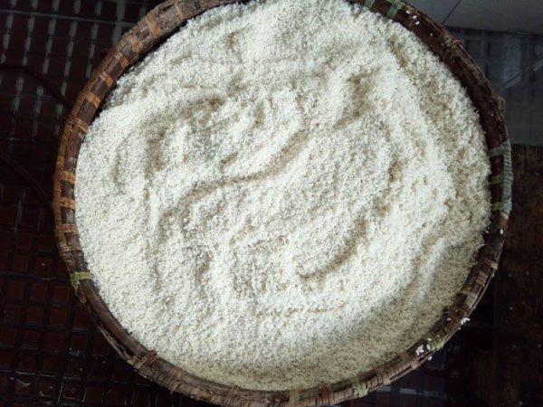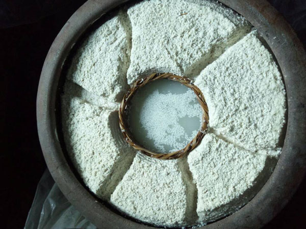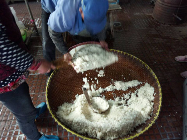 第三步:拌入酒曲,這時(shí)候才發(fā)現(xiàn)了“木桶”的神奇之處:一頭空,另一頭也是空,只不過用鋼筋做了個(gè)柵欄。之前蒸米飯,老徐是墊上了蒲草,一方面讓糯米飯更易熟,另一方面也增加了糯米飯的清香氣息。把糯米飯倒入蠶匾中,邊翻動(dòng)糯米飯邊撒上酒曲,使酒曲與糯米飯充分拌勻。