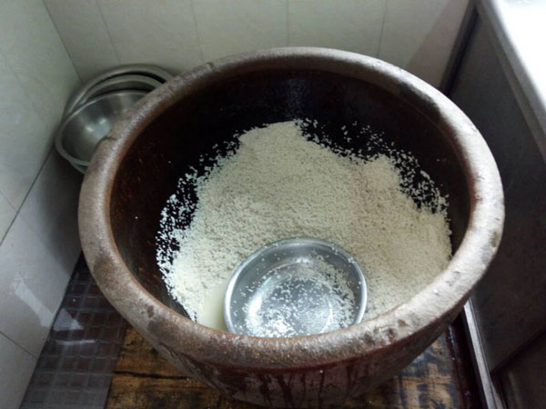 第二步:冷卻降溫,糯米蒸熟后,用冷水淋沐,直至糯米飯溫度降到35左右。要知道這個(gè)溫度非常關(guān)鍵,太冷了會(huì)影響之后酒曲發(fā)酵,溫度太高會(huì)把酒曲中的酵母殺死。不靠溫度計(jì),老徐靠得完全是自己多年的經(jīng)驗(yàn)。