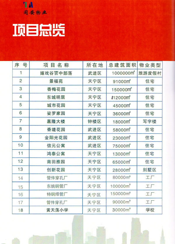 常州市同安物業(yè)管理有限公司注冊1999年,發(fā)展至今已有多年歷史,本公司坐落于美麗的龍城常州,秉承“融聚無限未來”的核心理念,融專業(yè)認才,匯優(yōu)質(zhì)資源以”專心,細心,耐心”的服務態(tài)度,為客戶打造“安心,順心,稱心”的服務感受。 公司始終以“打造中國最值得信賴和最值得尊重的物業(yè)管理服務集成商”為愿景自我鞭策,不斷前行。同安物業(yè)以客戶滿意為終極目標,不斷加強”崗位資格認證能力,人才招聘與職業(yè)化培訓能力,產(chǎn)品策劃與管理設(shè)計能力,品質(zhì)監(jiān)督與管控能力,技術(shù)更新與運營優(yōu)化力“五大專業(yè)能力的培養(yǎng)和提升,實現(xiàn)“精品化管理,專業(yè)化服務”。 公司發(fā)展至今,員工總數(shù)近千余人,大專以上學歷200多人,中高級技術(shù)人員160人,維修人員140人,物業(yè)管理師80名,公司接管面積達3100000多平方米,設(shè)涉及住宅小區(qū),別墅,大型游樂場,公園,醫(yī)院,廠區(qū),商業(yè)等。公司的工作管理逐步導入ISO9001質(zhì)量體系和ISO4001環(huán)境管理體系和GB/T28001職業(yè)健康安全管理體系,嚴格按照質(zhì)量體系的標準執(zhí)行。