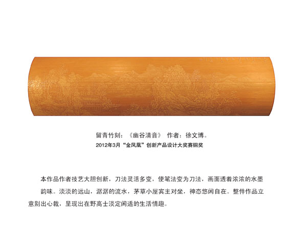 徐博(藝名文博),1973年生,江蘇武進(jìn)人,江蘇省省名人,高級工藝美術(shù)師,常州市留青竹刻非遺傳承人,常州工藝美術(shù)家協(xié)會理事,被譽(yù)為當(dāng)今中國最具創(chuàng)新意識的新銳竹刻家代表,多次獲得國家工藝美術(shù)大獎?釔哿羟嘀窨痰男煳牟┵p竹為樂,以竹詠志,借竹抒懷,悉心探索留青竹刻的藝術(shù)表現(xiàn)。在中國工藝美術(shù)大師蕭劍波的精心指導(dǎo)下,開創(chuàng)留青水墨山水之技法,更好的體現(xiàn)了竹刻淡雅清秀的藝術(shù)風(fēng)格,并不斷汲取書畫、攝影、雕塑等藝術(shù)精華,不斷滋養(yǎng)藝術(shù)情趣,提升擴(kuò)展胸襟人格的同時也逐步形成了其形神兼?zhèn)洌搶?shí)相生,氣韻生動的藝術(shù)特點(diǎn),作品為眾多的國內(nèi)外收藏家珍藏。
