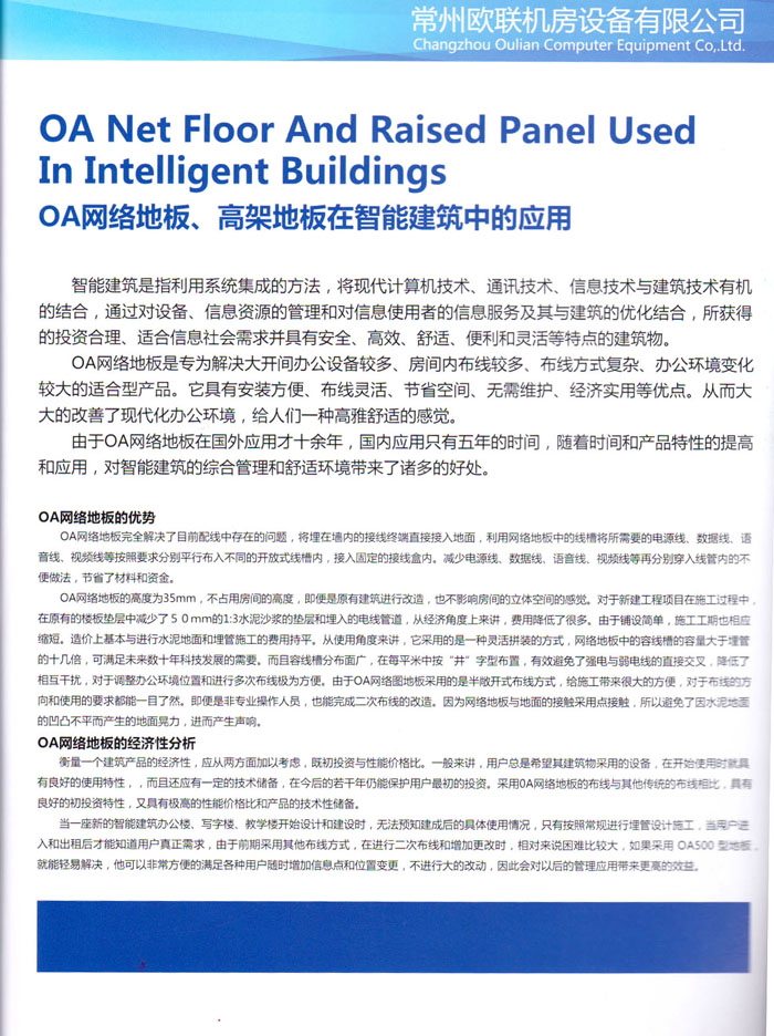 “歐聯(lián)”系列全鋼地板,符合國(guó)家安全要求,種類完備多樣,其中防靜電陶瓷地板、硫酸鈣地板等除具有普通瓷質(zhì)的裝飾和實(shí)用性外,其耐磨、防水、防火功能優(yōu)于其它同類產(chǎn)品,防靜電系列地板,能切合不同客戶的要求,其靈活的配置,深受客戶歡迎,不同材質(zhì)的地板結(jié)構(gòu)使設(shè)計(jì)師的設(shè)計(jì)空間比傳統(tǒng)的更加廣闊自由和善變。